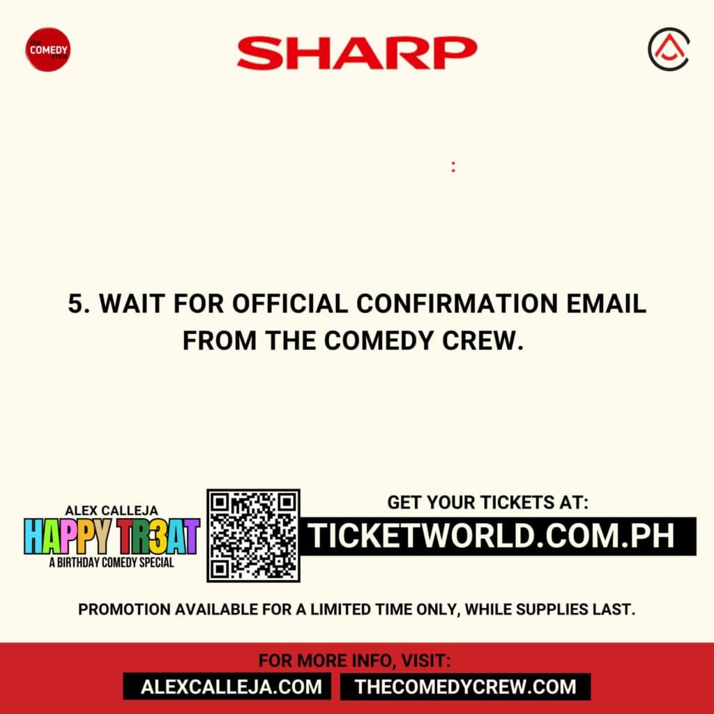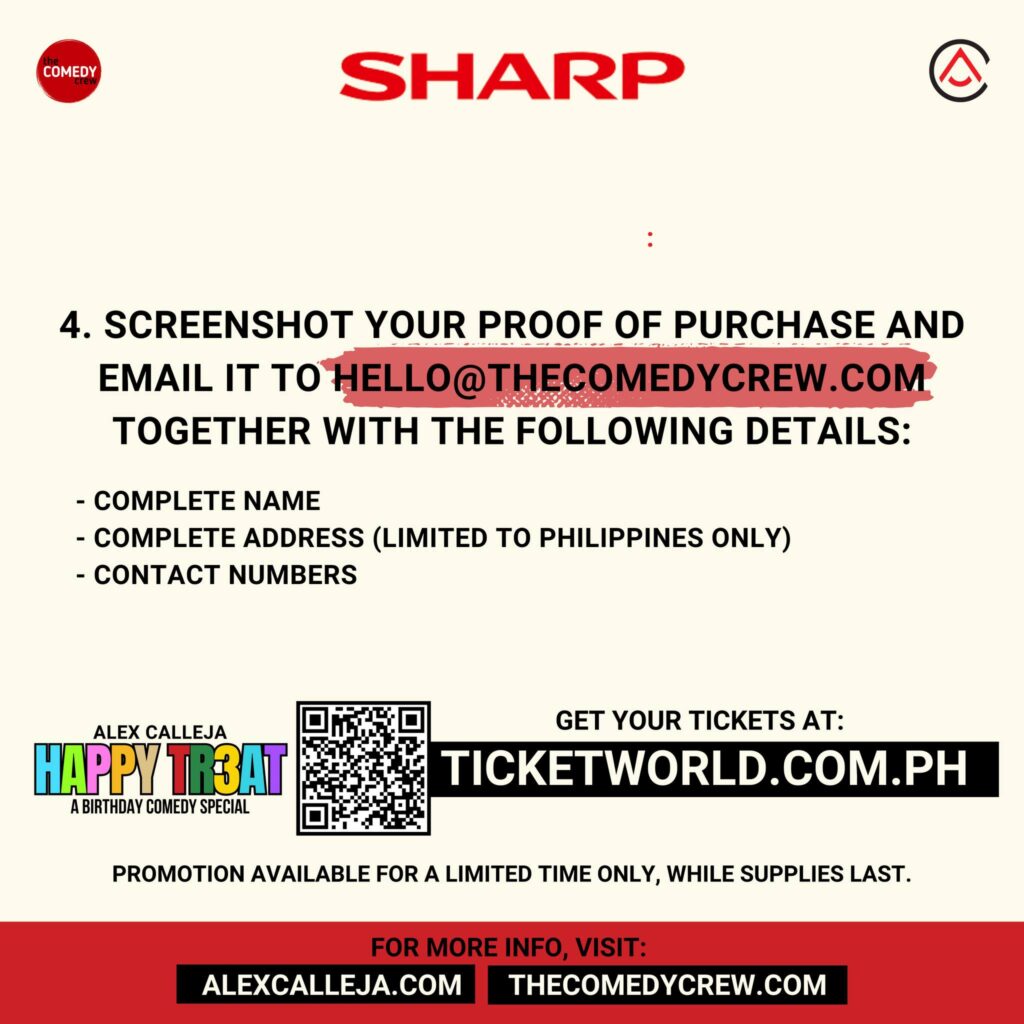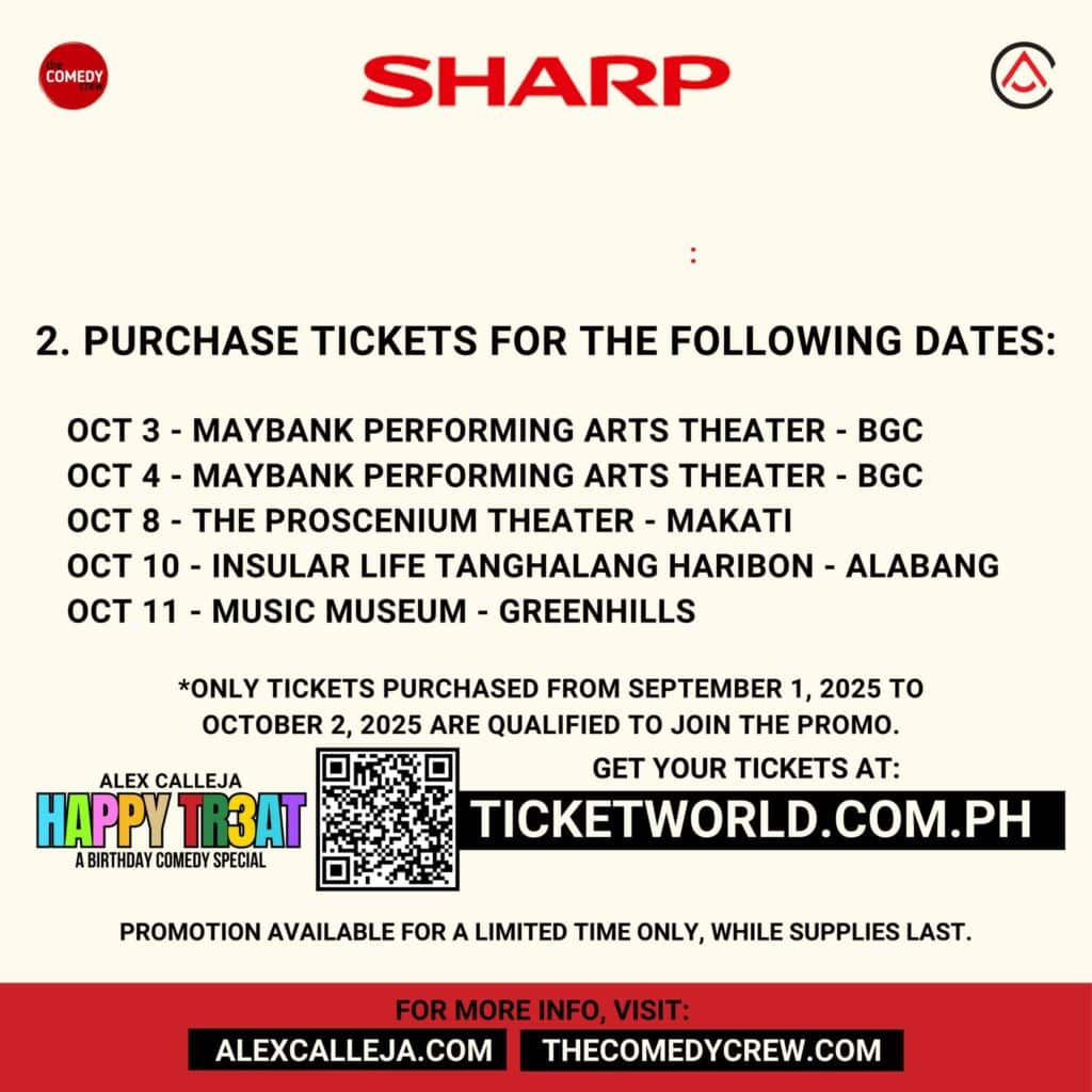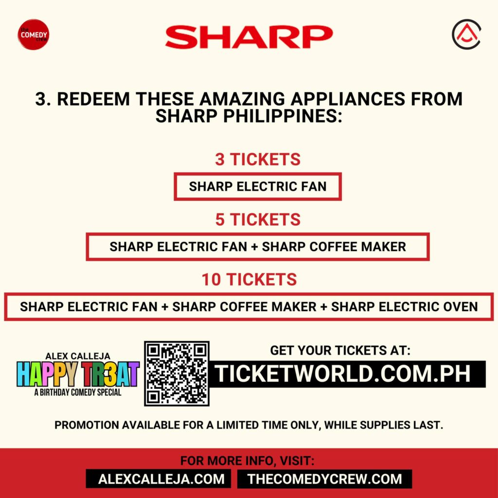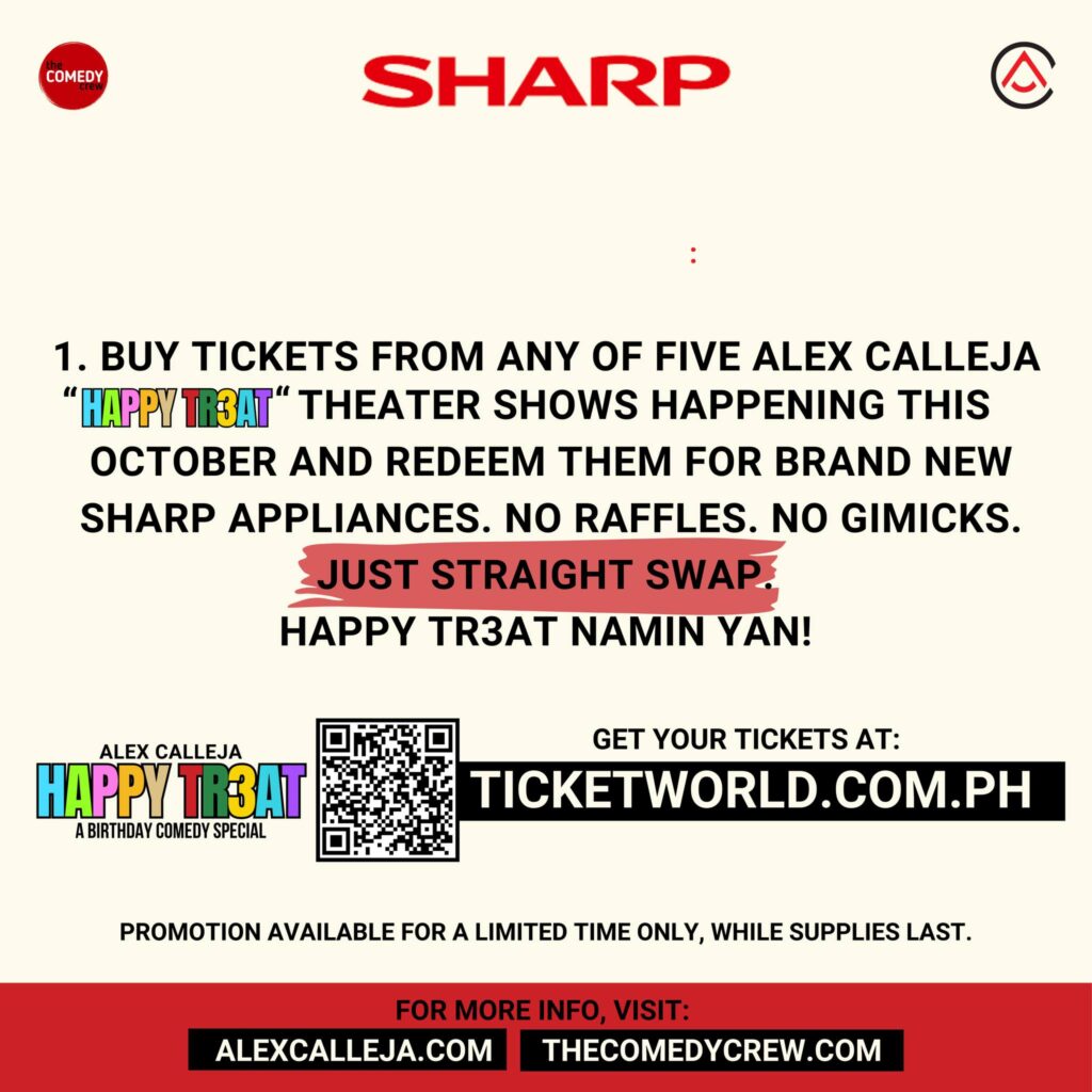 1️⃣Buy tickets from any of five Alex Calleja “HAPPY TR3AT” theater shows happening this October and redeem them for brand new Sharp Appliances.